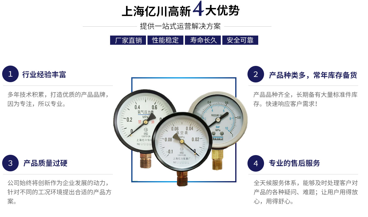 億川高新儀器儀表有限公司專業生產各類規格型號的壓力表,產品包括普通壓力表,不銹鋼壓力表(不銹鋼耐震YB-60/YB-100/YB-150),真空壓力表,氧氣專用(YQ-60/YQ-100/YQ-150),普通(磁助式)電接點壓力表(耐震電接點)YXC-100,耐震壓力表YN-100,隔膜壓力表YTPML-100,膜片壓力表YPT-100,膜盒壓力表YE-100,矩形壓力表YEJ-100,雙針壓力表YTZ-100,氨氣壓力表YA-100,遠傳壓力表YTZ-150,防爆電接點壓力表,軸向壓力表等壓力表系列產品。 億川高新始終以"質量求生存,創新為突破。顧客為中心"的發展理念,通過引進國外先進技術,歷經二十多年的技術沉淀,生產出一系列在消費者中有著良好口碑的產品。